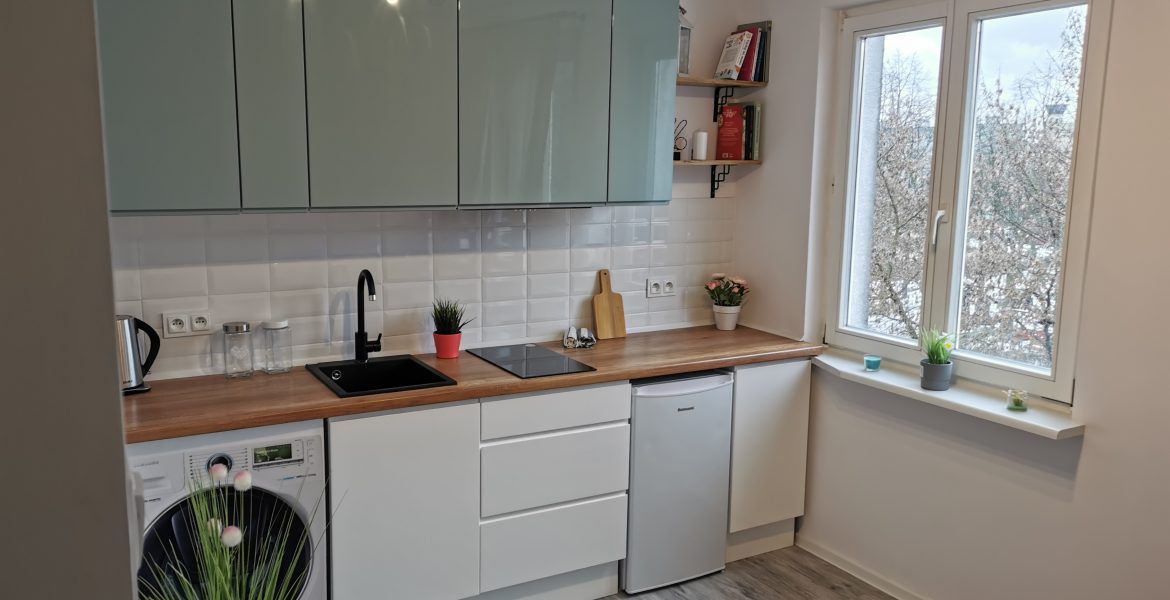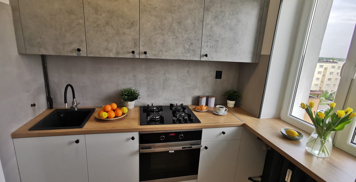 Remont kawalerki 18m2 – pokój z aneksem kuchennym oraz łazienką i przedpokojem z dużą szafą przy ul. Kusocińskiego 7 w Piasecznie